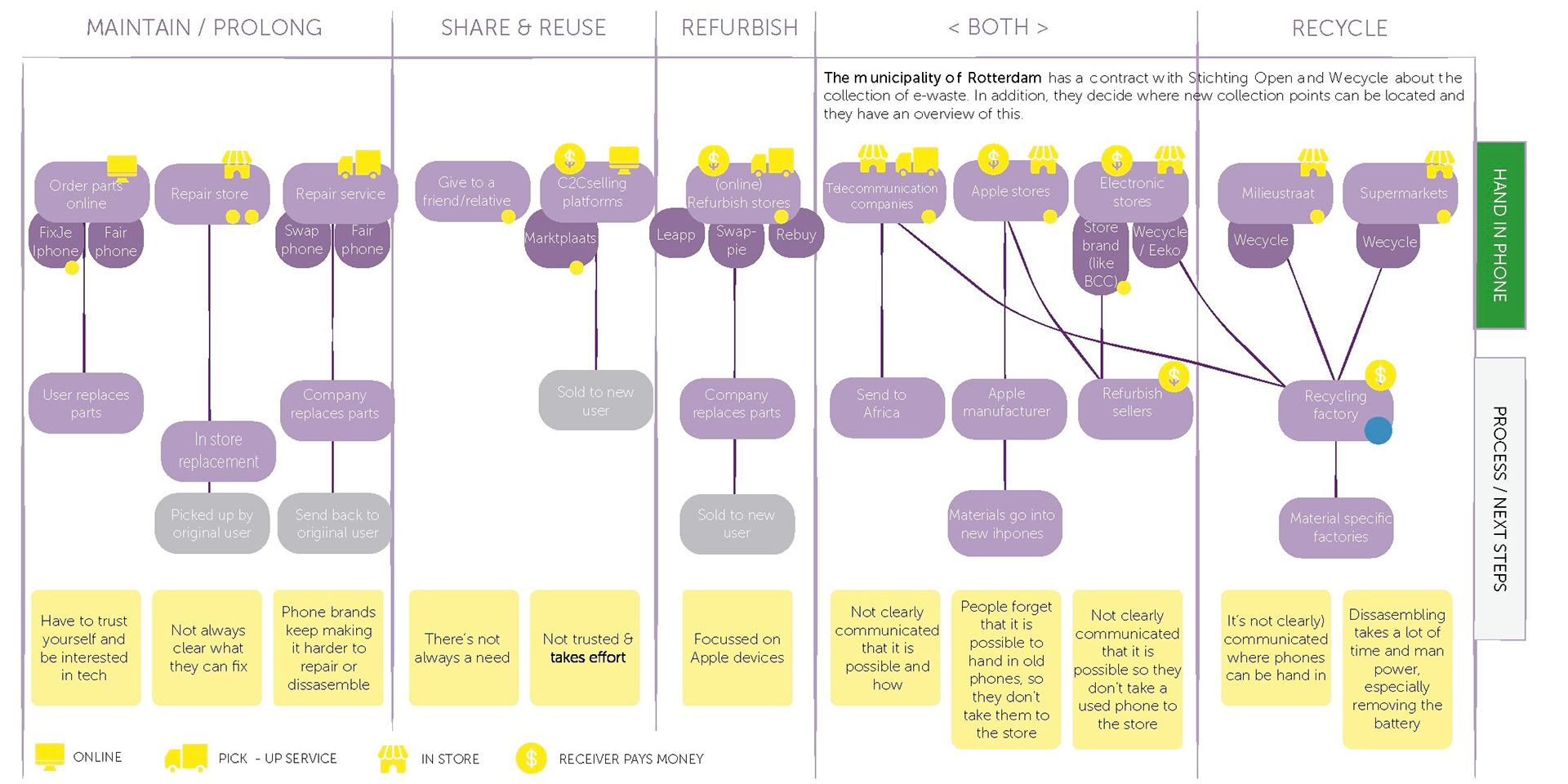 By conducting explorative research and interviews, we found that people have little knowledge nor awareness about giving used phones a new life. If they know, it still takes a lot of effort to find the right place to safely hand it in making it unaccessible for most people. Our goal was to create an accessible and pro-active handling in process of used phones where both users and direct stakeholders feel responsible, by making the whole process and its consequences transparent.