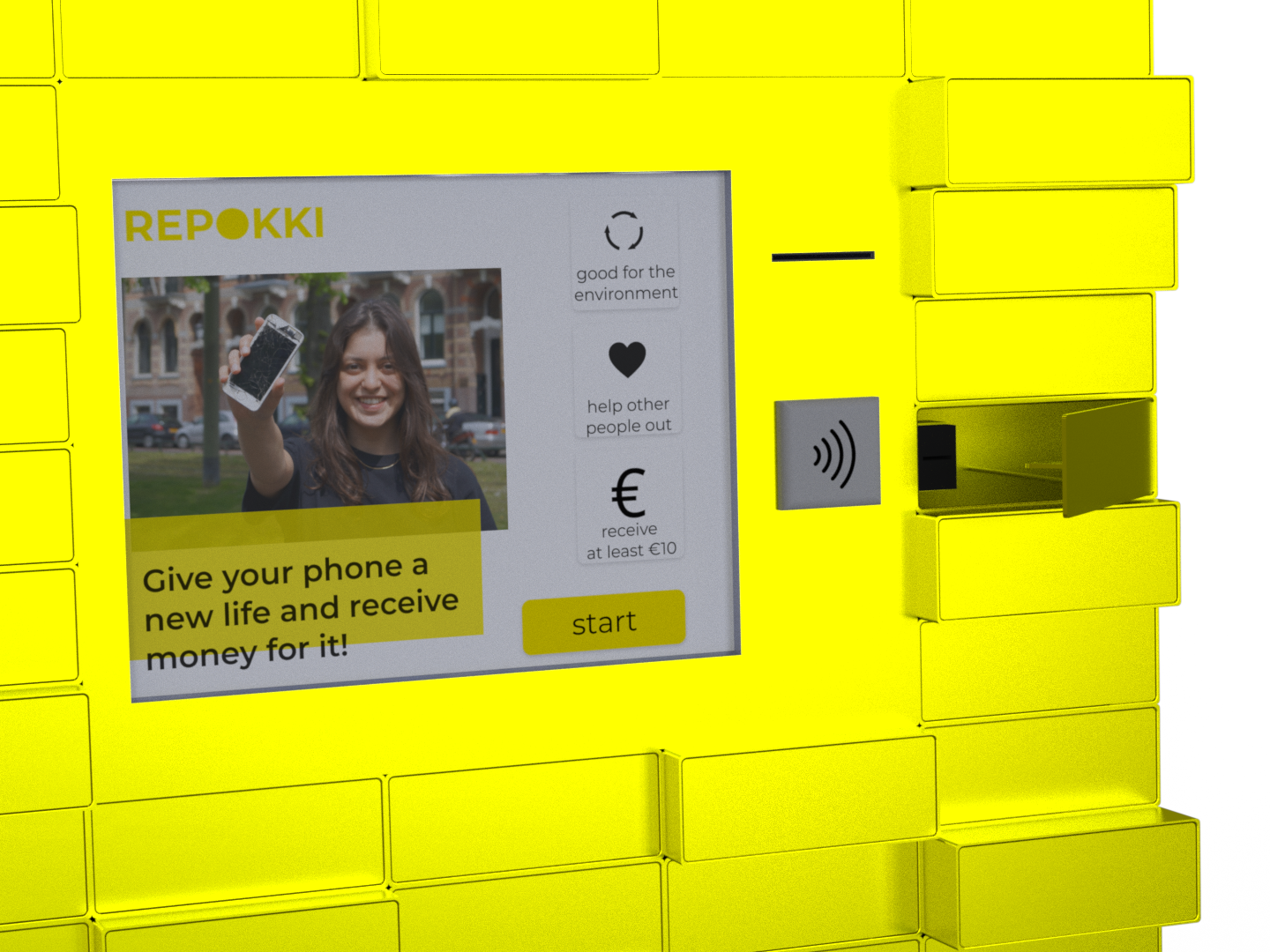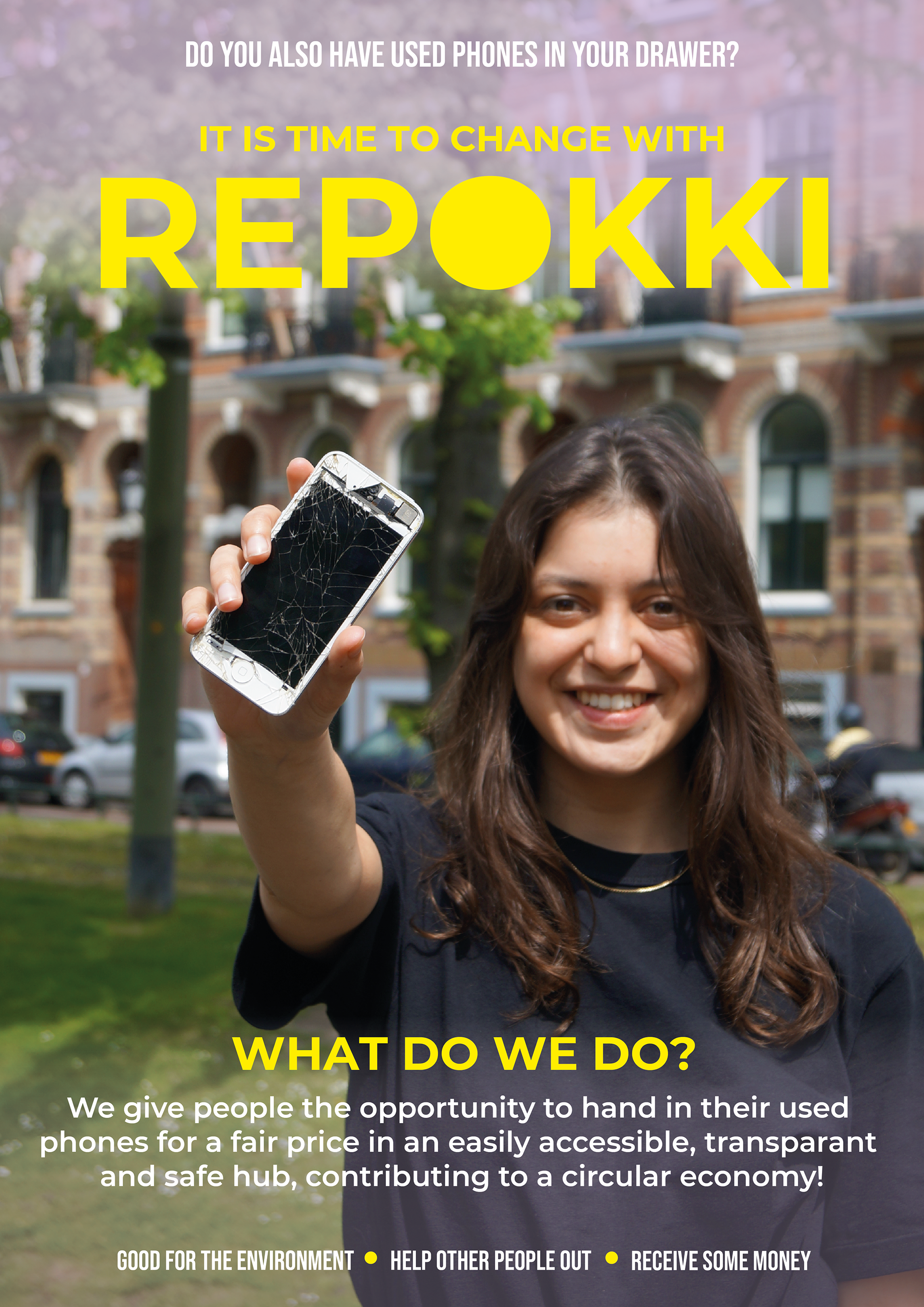 We came up with REPOKKI, a circular service that facilitates and guides people to hand in used phones in an accessible and transparant way. This is done with the use of a modular hub located in supermarkets and electronic stores. Since we obviously desired a durable solution, REPOKKI also redesigned the system in which different stakeholders, such as the municipality of Rotterdam & recycling- and refurbishing companies are working together to put these handed-in phones back into the circular economy.